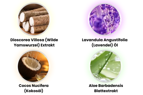 Dioscorea Villosa (Wild Yam) Wurzelextrakt, Lavandula Angustifolia (Lavendelöl), Cocos Nucifera (Kokosöl), Aloe Barbadensis (Aloe Vera) Blattextrakt